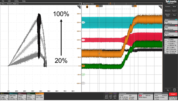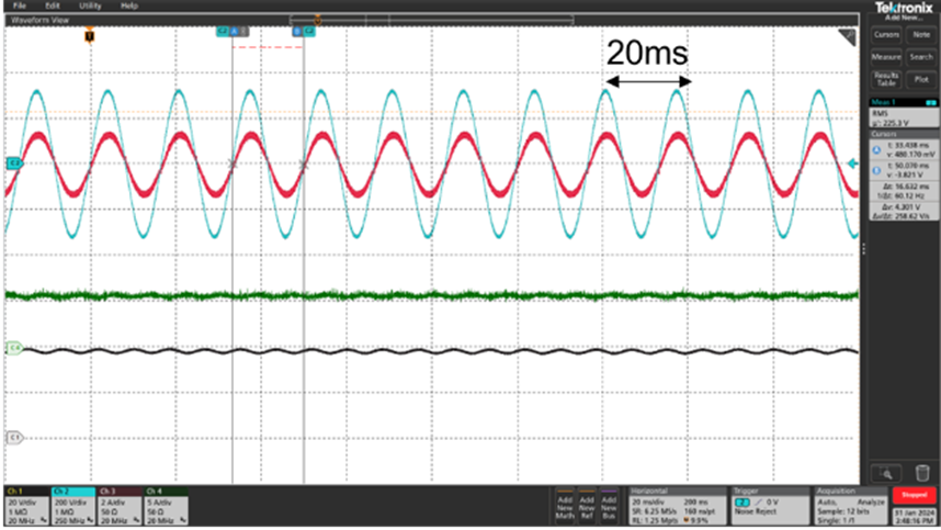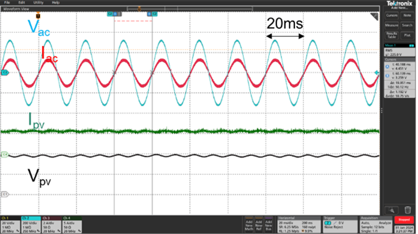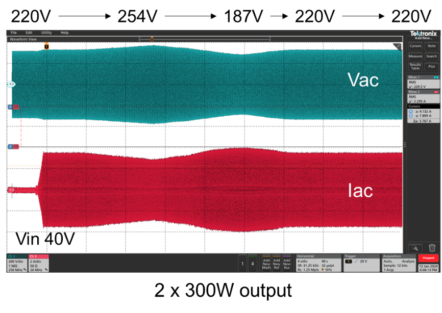 下圖是微型逆變器工作在187 – 254V電網(wǎng)電壓下2 x 300W功率輸出的波形,微型逆變器可以在不同的電網(wǎng)電壓下進行可靠工作。