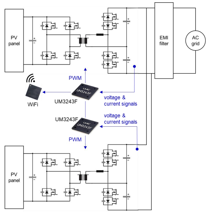 在光伏微型逆變器控制模塊中,主要組成部分包括廣芯微自研主控高性能數(shù)字電源MCU UM3243F、功率半導體、無源元件和柵極驅動電路等。通過獨立UM3243F控制,實現(xiàn)兩路光伏電流輸入,一路交流電流輸出的2-in-1光伏微型逆變器方案。UM3243F以其高性能指標與數(shù)字電源控制算法,可以完全取代以往基于DSP的實現(xiàn)方案。