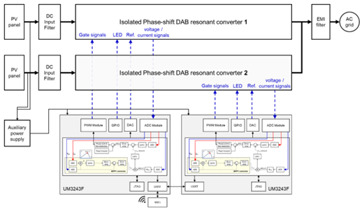 光伏逆變器是將光伏(PV)太陽能板產生的可變直流電壓轉換為市電頻率交流電(AC)的逆變器,并網(wǎng)輸入到電網(wǎng)輸電系統(tǒng)。光伏逆變器是光伏發(fā)電系統(tǒng)中重要的組成部分,可以配合一般交流供電的設備使用。為給客戶提供一個穩(wěn)定高效、安全可靠、支持快速驗證與二次開發(fā)的光伏微型并網(wǎng)逆變器的參考設計方案,廣芯微電子(廣州)股份有限公司采用自研UM3243F主芯片,設計了一套2-in-1光伏微型并網(wǎng)逆變器方案平臺,實現(xiàn)單級變壓拓撲,單板尺寸僅為175mm x 155mm,單板高度為23mm。該拓撲結構還可用于AC-DC開關電源等數(shù)字電源領域,有助于提升效率、縮減尺寸、減少BOM和降低功耗。