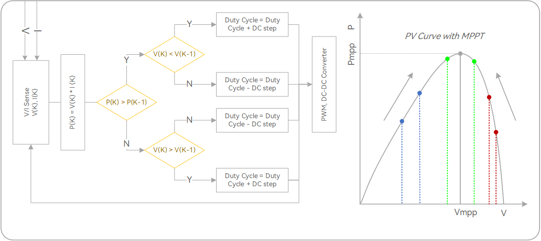 擾動(dòng)觀察法(Perturb and Observe)是使用較廣泛的一種MPPT算法,擾動(dòng)觀察法也叫爬山法。其工作原理是給一個(gè)擾動(dòng)輸出電壓信號(hào)(U±△U),再測(cè)量并計(jì)算其功率P(K)的變化,并與擾動(dòng)之前的功率值P(K-1)相比,根據(jù)比較結(jié)果調(diào)整擾動(dòng)方向, 參考以下的擾動(dòng)過(guò)程。