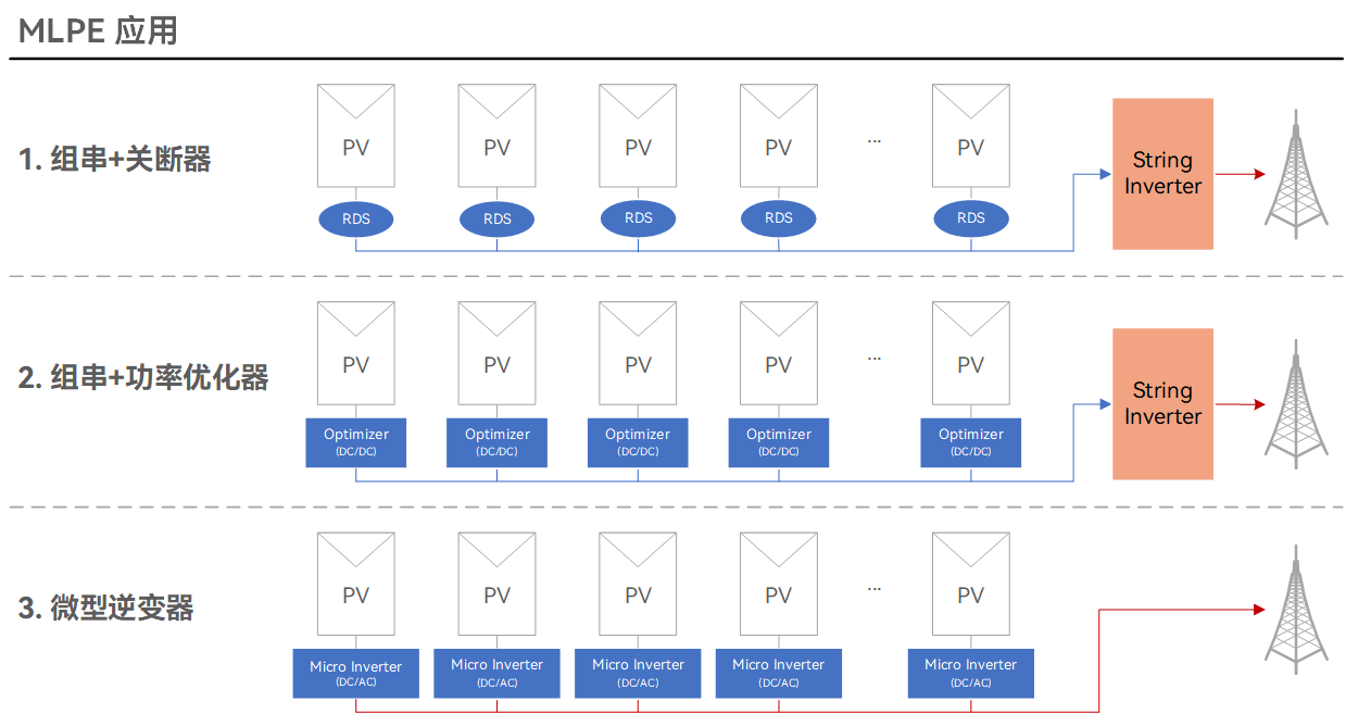 MLPE (Module Level Power Electronics) 組件級(jí)電力電子,是指一類(lèi)能夠?qū)﹄娔苓M(jìn)行精細(xì)化控制的電力電子器件,包括關(guān)斷器、功率優(yōu)化器、微型逆變器等。目前MLPE已在分布式光伏市場(chǎng)中得以廣泛應(yīng)用,主要發(fā)揮著對(duì)單個(gè)或幾個(gè)光伏組件電力進(jìn)行逆變、關(guān)斷、監(jiān)控、功率優(yōu)化等功能的作用。