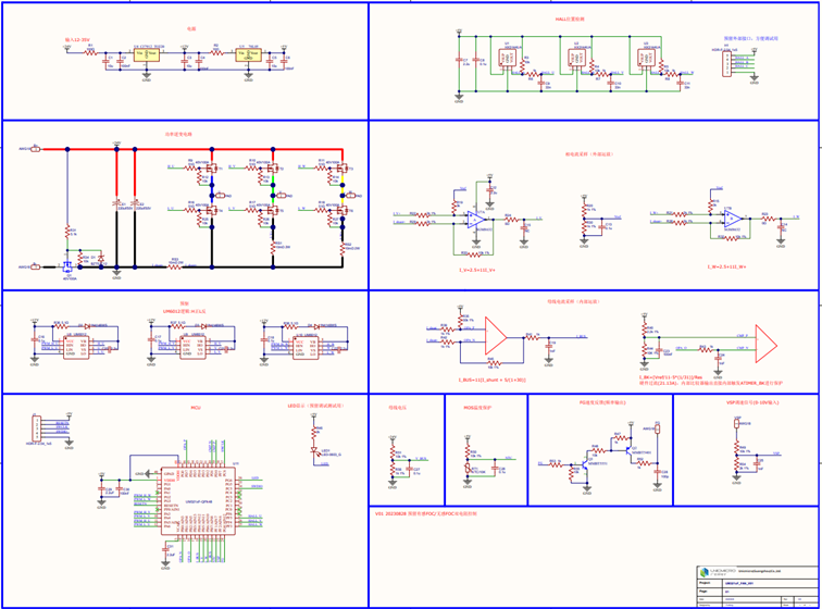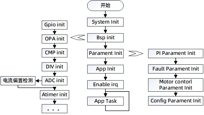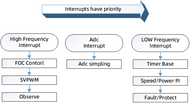 電機控制部分主要在高頻中斷中執行運算,主要處理FOC運算部分,及位置速度觀測器。ADC中斷主要處理采樣數據,低頻中斷主要處理速度/功率外環控制部分及故障檢測部分。