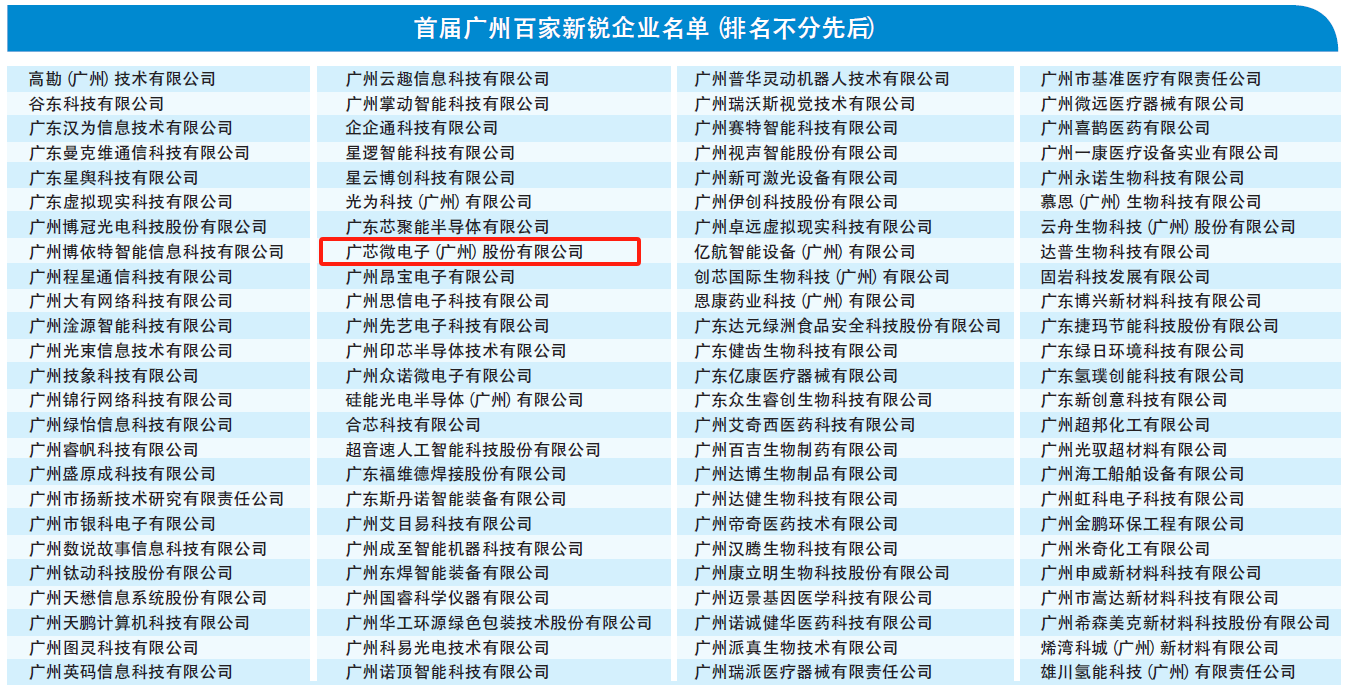 今年3月,為踐行新發展理念,推動廣州市中小民營企業創新發展,厚植廣州產業根基,由廣州市委統戰部、市工商聯、市工信局、市國資委、市科技局聯合開展的廣州首屆百家新銳企業培優計劃正式啟動,評審委員會經過多輪評審,再進行調研走訪,由專委會代表進行綜合研判,最終確定了百強名單。廣芯微電子憑借創新科研實力在最具創新代表性企業中脫穎而出,被評為“首屆廣州百家新銳企業”。