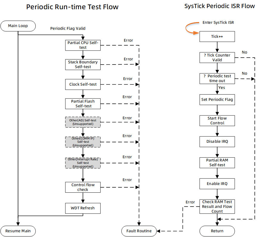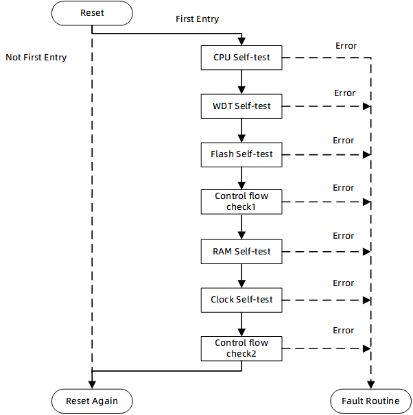 運(yùn)行時(shí)自檢項(xiàng):CPU部分寄存器自檢、Flash分塊自檢、RAM分塊自檢、棧上溢/下溢檢測,系統(tǒng)時(shí)鐘和中斷自檢。部分檢測功能可通過修改宏定義值進(jìn)行開關(guān)和配置。