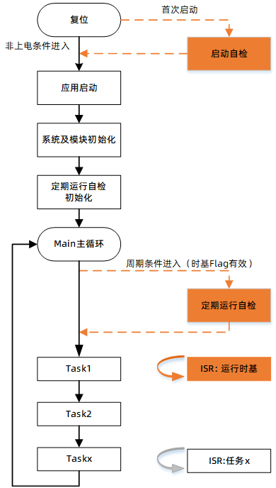 啟動(dòng)時(shí)自檢項(xiàng):CPU寄存器自檢、程序計(jì)數(shù)器PC自檢、看門狗自檢、Flash內(nèi)容完整性校驗(yàn)、RAM自檢、系統(tǒng)時(shí)鐘和中斷自檢,以及針對完整測試過程的流程控制與監(jiān)測。