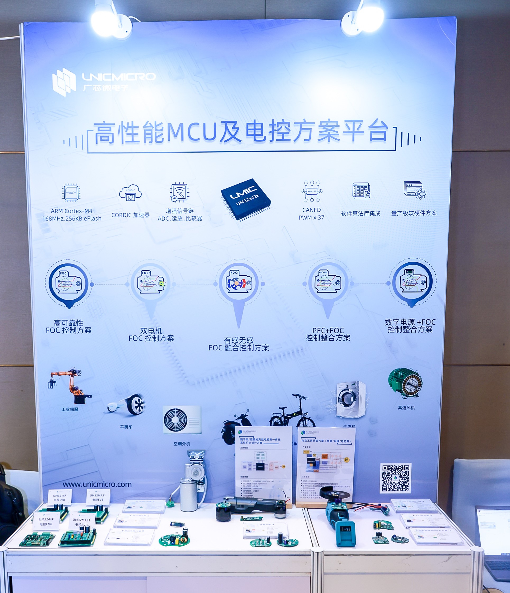 本次大會廣芯微還展出了面向雙電機、伺服電機控制等高端產品應用的電控MCU UM32x42x,芯片采用Cortex-M4核,最高工作頻率為168MHz,256KB eFlash,64KB SRAM配置,芯片支持高速CAN-FD接口,模擬信號鏈,硬件加密算法,硬件加速運算協處理器等,并針對單/雙/三電阻FOC控制需求,定制設計的高速多路PWM,支持硬件移相控制功能,最高分辨率達到1.48ns、2個高速ADC(5.25Msps)、內置多路高速比較器與高速運放,模擬電路針對FOC控制與各種外設做了豐富的聯動,既能發揮極致性能,同時也最大化簡化外圍電路,節省成本、提高可靠性。該產品核心配置參數如下: