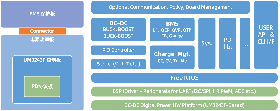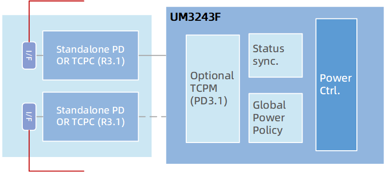 可選的PD接口模塊 既支持采用獨立的PD芯片,也支持采用TCPC類型的PD協議芯片開發設計。主控芯片UM324x通過I2C控制PD接口和同步狀態信息,TCPM的控制功能也是可選支持的,而電源的系統策略則統一做在主控板上,以實現功率的統一分配與調度,電壓檔位調整由主控按端口獨立調整。