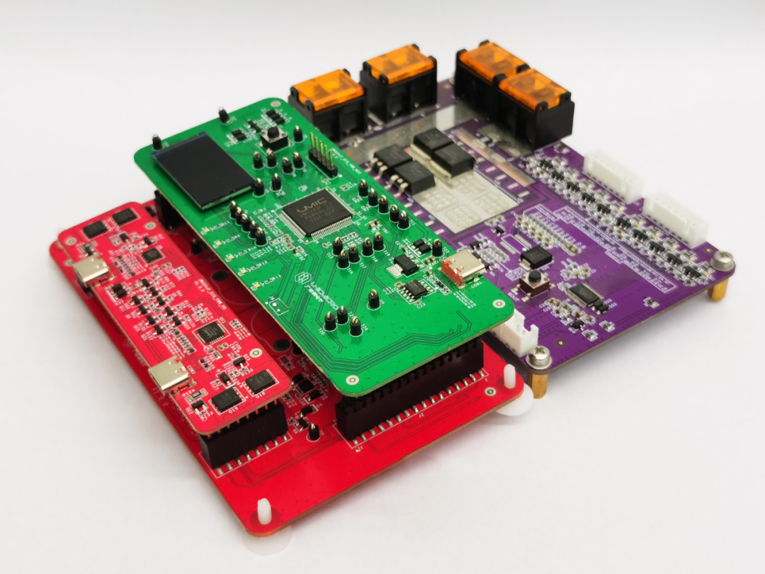 上圖所示為廣芯微DC-DC數字電源平臺Demo板,包含功率板(大紅板),DC-DC主控板(綠板),PD接口板(小紅板)和BMS板 (紫色板)。