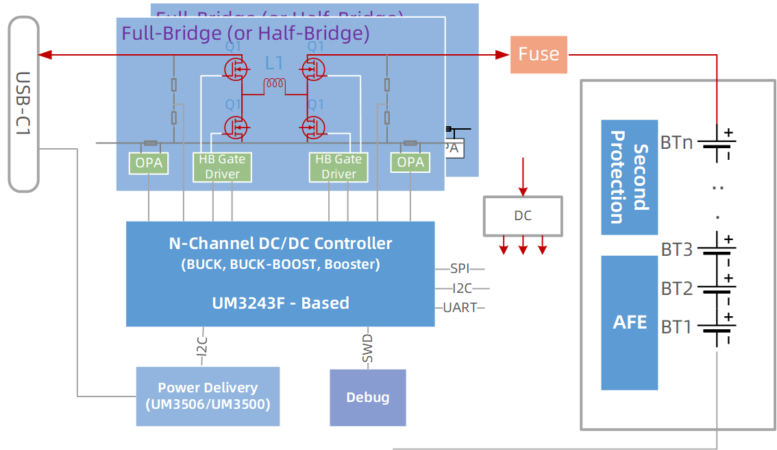 數字電源平臺DEMO的硬件方案以移動儲能應用做為示例,通過Type-C接口實現基于PD快充協議的充放電管理。在Demo系統里,廣芯微選用兩顆UM3506芯片(也可以使用僅支持PD AFE芯片UM5100)實現兩路電源,一路支持240W PD3.1 DRP,另一路支持140W PD3.1 SRC。如圖所示為一路的全橋的DC-DC功率板設計,其主要模塊有四個GaN開關管、兩個Gate Driver、兩個低側的電流檢測。控制板則是基于廣芯微UM3243G/F系列芯片實現一對多的電源變換控制器,通過I2C/UART/SPI等外設與外部實現數據交互,通過SWD可以現實便捷的代碼調試。右邊為BMS電池管理系統,有BMS的一級保護,還有純硬件的二級保護,目前方案中為10串電池。