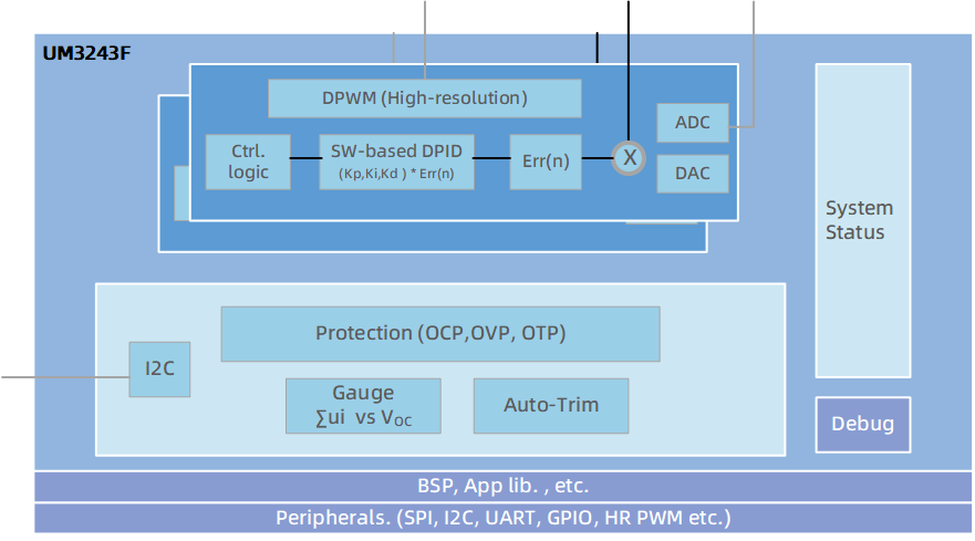 數字電源(Digital Power)是一種能夠通過微處理器控制的開關電源(SMPS),其輸出電壓、電流等參數都可以由數字信號進行實時和連續的調節,通過輸出相應的PWM波形控制開關管驅動變化,從而精確調控電源輸出電壓、電流等參數,提供更加穩定可靠的電源輸出。采用數字電源技術,可以提升功率密度、實現更快的控制環路,該系統還可以通過通信接口實現與遠程控制器等設備的通信,實現遠程操作和數據分析,提高了電源系統的智能化程度。