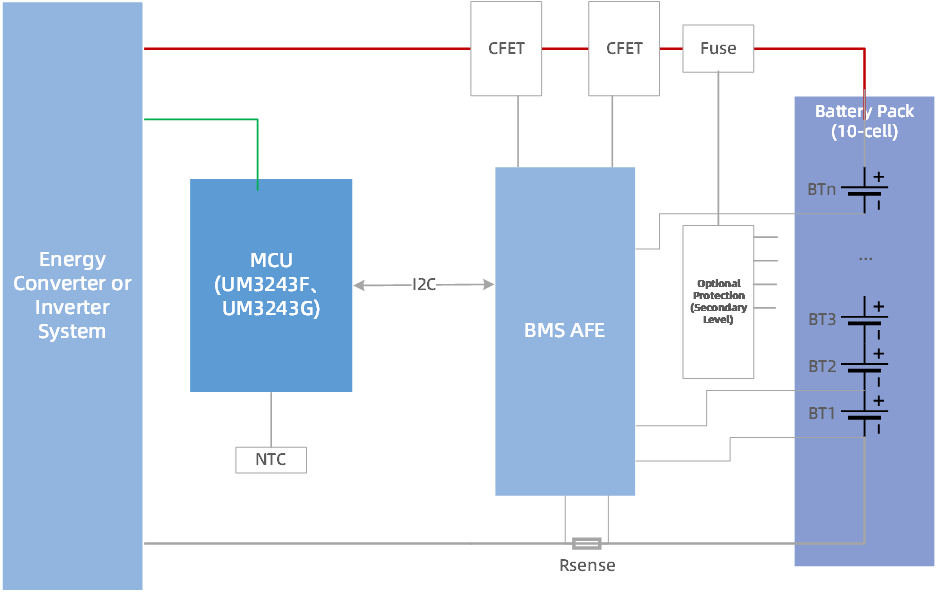 電池管理系統模塊采用高端串聯架構方案,靈活電芯串數配置。主要功能包括,電壓、電流以及溫度測量、電池健康狀態、電池剩余電量、電池能提供功率的狀態、電芯充電平衡、電池一級保護、計量、上電自檢、自校準,并通過I2C與后端的MCU作信息交互。