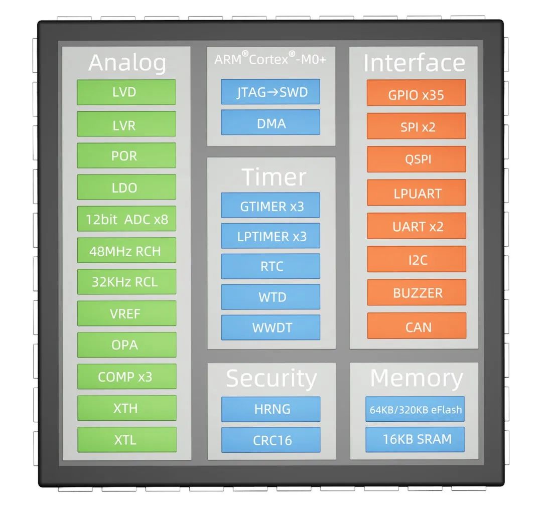 UM321xA系列芯片是廣芯微電子(廣州)股份有限公司研制的基于ARM Cortex-M0+內(nèi)核的超低功耗、Low Pin Count、寬電壓工作范圍的32位IoTP處理器SoC芯片系列,重點面向物聯(lián)網(wǎng)行業(yè)便攜式傳感測量系統(tǒng)中的電池應(yīng)用場景。依據(jù)行業(yè)應(yīng)用場景的具體應(yīng)用需求,芯片系統(tǒng)采用了獨特的低功耗設(shè)計技術(shù),內(nèi)部集成了CAN、12位SAR ADC、UART、SPI、QSPI、I2C等通用外圍通訊接口,ADC、OPA、比較器等傳感獲取接口,以及LPUART、LPTIMER、WDT等超低功耗模塊接口。具有高整合度、高抗干擾、高可靠性和超低功耗等技術(shù)特點。內(nèi)置RC高頻和低頻振蕩器,支持免晶振應(yīng)用。支持Keil MDK集成開發(fā)環(huán)境,支持C語言和匯編語言進(jìn)行軟件開發(fā)。