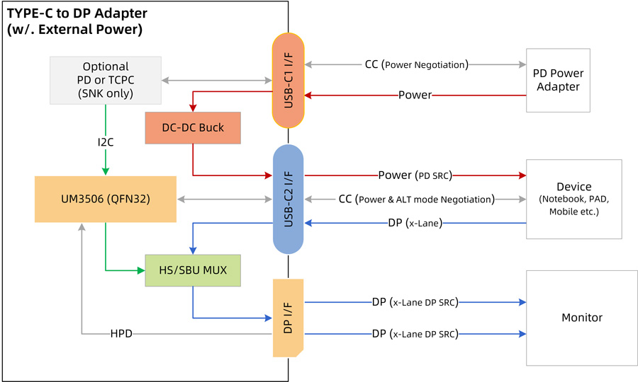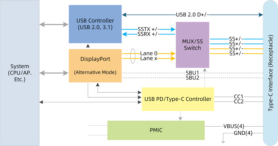 從以下的功能框圖看到,主機系統中USB和DP控制器,MUX/SS Switch,PD控制器,乃至電源控制器均是協同工作。其中的高速數據都是USB Host控制器以及 DP Source控制器的源格式。