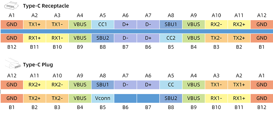 上圖中上半部分是Type-C母頭,下半部分是Type-C公頭,公頭比母頭少一組D+D-,這個設計是為了方便正反插。其中: