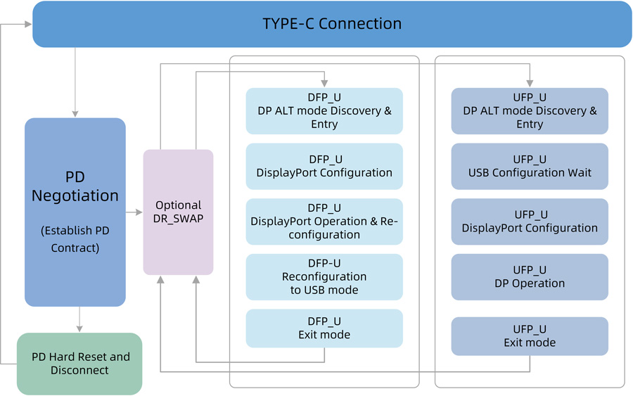 Type-C DP ALT模式協商流程都是通過USB PD協議的通信功能來完成,它是采用PD協議中VDM(Vender-Define message)的協議交互讓相連的設備進入 DP等數據傳輸功能。