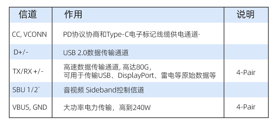 USB Type-C作為一種更為先進的物理接口,全功能滿PIN (24PIN)下可以提供多種控制及傳輸通道,在PD協議的配合下,可進行電力協商及接口工作模式的協商,從而啟用相應的通道功能。