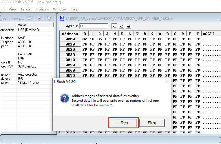首先打開J-Flash工具。點擊open data file,打開用戶app程序的bin或者hex文件。這里選擇軟件開發包里UM800Y_APP文件夾中的Lptimer工程中的bin文件。(可通過hex2bin工具將hex轉換成bin文件)