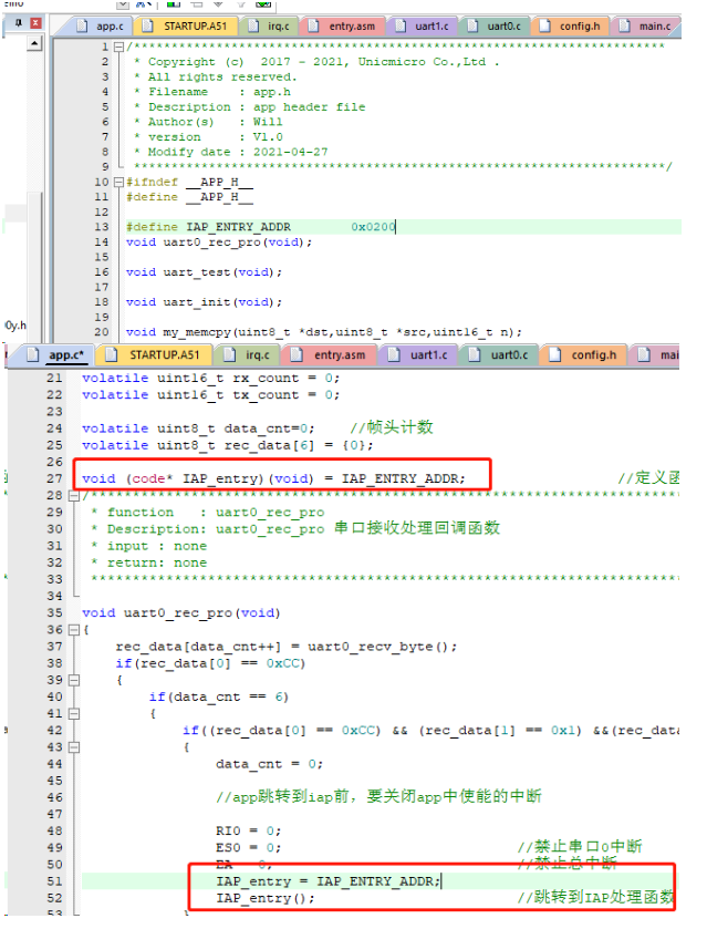 本例程使用UART0的回調函數調用IAP處理函數去更新升級應用程序(UART0的波特率需和IAP程序的一致)。調用IAP處理函數的方法如下,根據5的配置來設置的IAP入口地址值(IAP函數的地址為0x0200)在用戶APP程序的檢查更新函數中,定義一個函數指針,指向該地址,當UART收到請求更新信息時用于跳轉,設置如圖8所示。