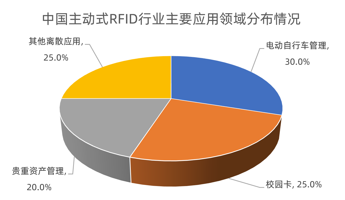 根據(jù)物聯(lián)傳媒公布的數(shù)據(jù)顯示,近幾年我國(guó)主動(dòng)式RFID整體出貨量每年大約3000萬,市場(chǎng)產(chǎn)值為數(shù)十億元,其最主要的應(yīng)用有校園卡、電動(dòng)自行車管理、貴重資產(chǎn)管理以及其他的零散應(yīng)用,尤其校園卡應(yīng)用與電動(dòng)自行車管理是有源RFID最為集中的應(yīng)用場(chǎng)景。根據(jù)物聯(lián)傳媒發(fā)布的數(shù)據(jù)顯示,在主動(dòng)式RFID主要應(yīng)用領(lǐng)域中,電動(dòng)自行車管理領(lǐng)域應(yīng)用占比達(dá)30%,校園卡應(yīng)用占比為25%,貴重資產(chǎn)管理領(lǐng)域應(yīng)用占比為20%。