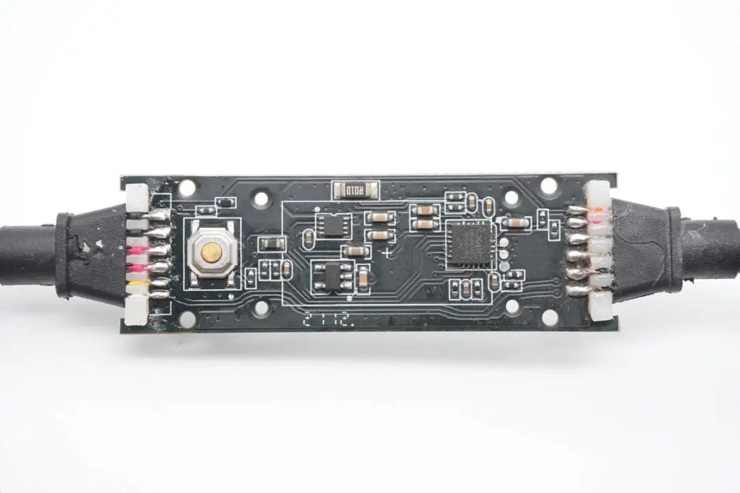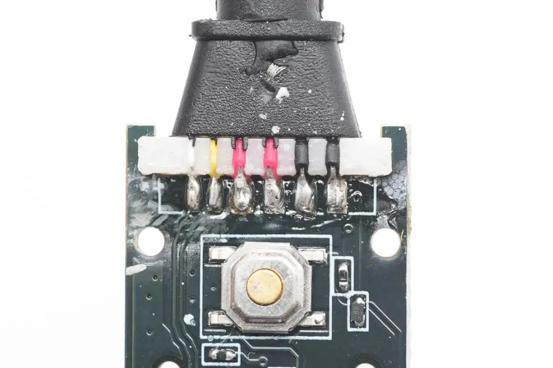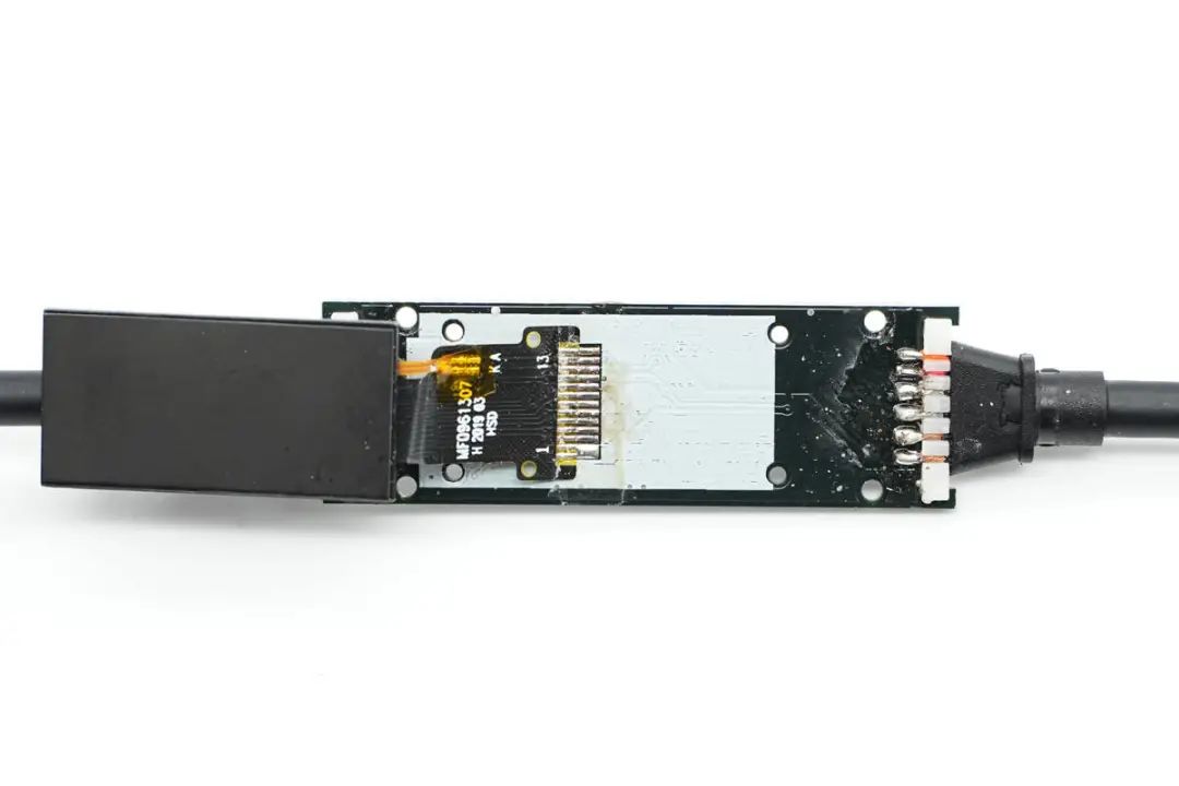 沿外殼接縫撬開外殼,數(shù)據(jù)線焊接到內(nèi)部PCBA模塊上,同時還焊接液晶屏幕,液晶屏幕底部使用一塊灰色塑料支架支撐固定。