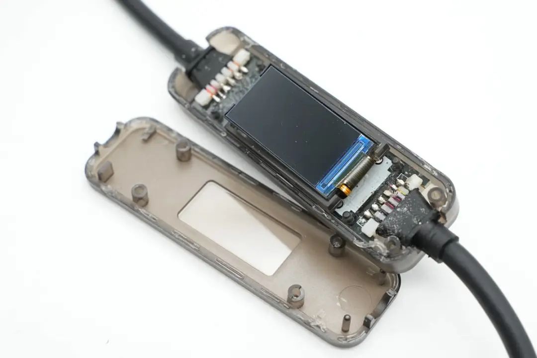 數(shù)據(jù)線使用魔術(shù)扎帶捆扎整理,不僅支持100W PD快充,而且自帶0.96英寸顯示屏幕,主體外殼還采用半透明設(shè)計,隱約可見內(nèi)部PCB板和芯片,十分硬核。