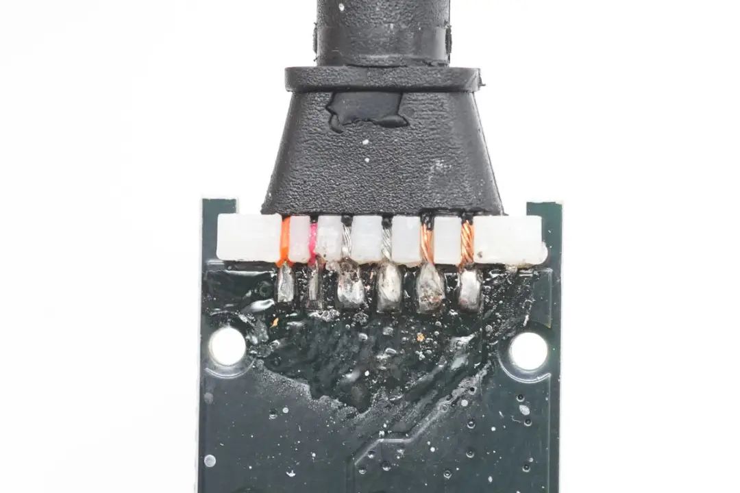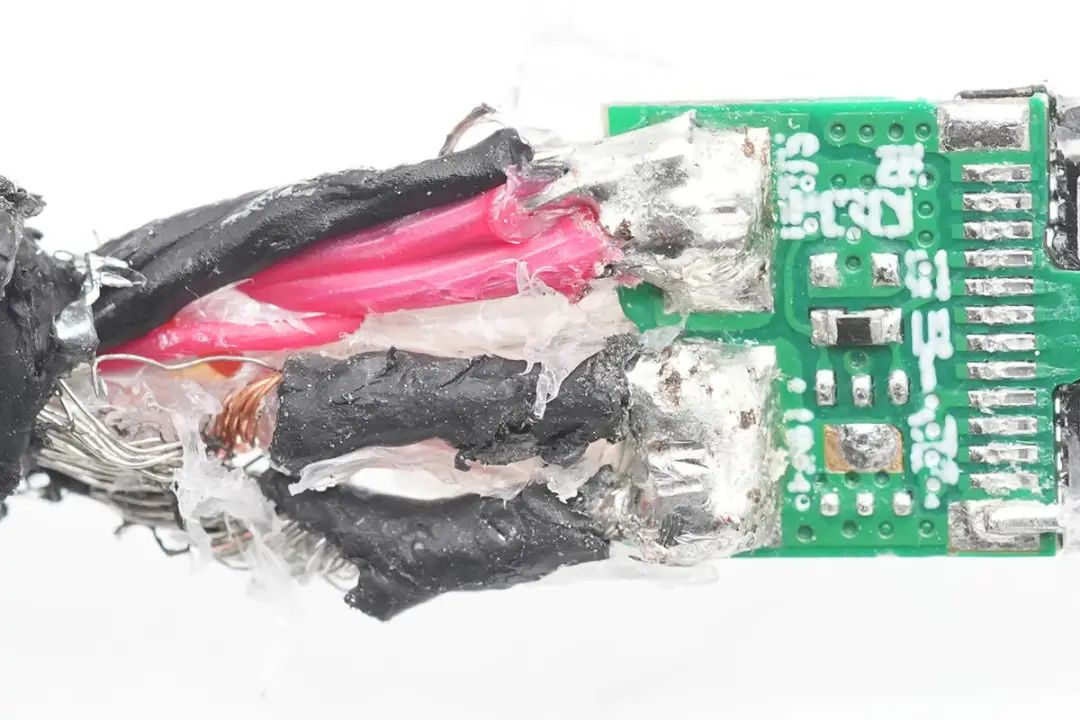 首先沿側(cè)面切開端子外殼,外殼為整體注塑,線纜焊接處通過硬膠固定。